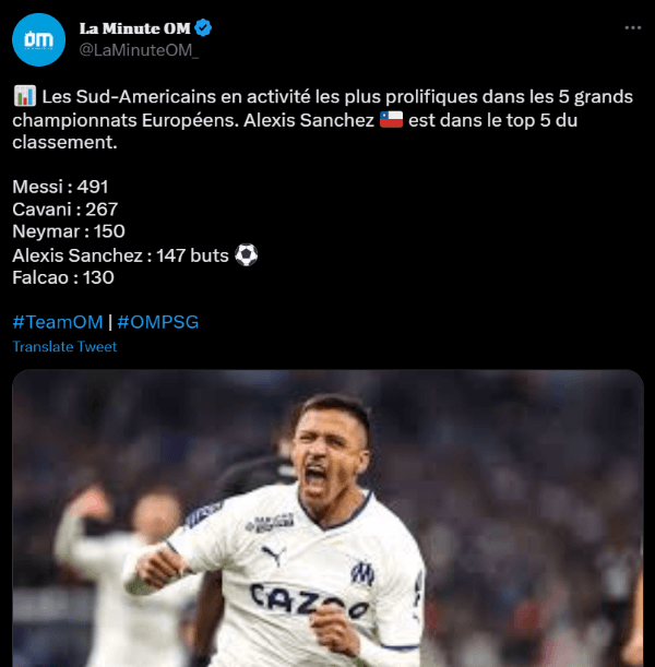 Y en la antesala a ese duelo contra los parisinos, que se disputará este domingo 26 de febrero a contar de las 16:45 horas, el OM infló el pecho de orgullo por el goleador top tocopillano, máximo artillero del equipo en el certamen liguero con nueve conquistas e histórico anotador de la selección chilena.