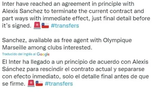 Si bien otros medios de comunicación lo habían reportado antes, el periodista italiano habla del futuro del chileno dando una sensación de seguridad sobre lo que pasará en los próximos días. El reportero dio a conocer que la desincorporación del delantero del Inter de Milán está solucionada.
