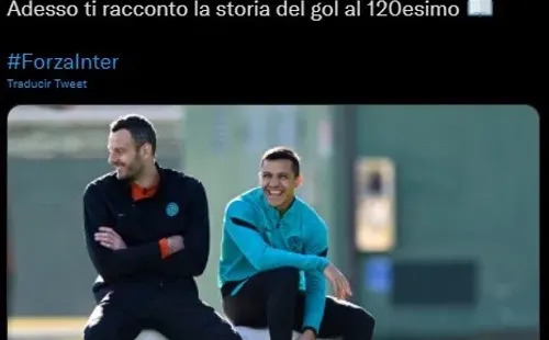 En la imagen sale Alexis y el arquero Samir Handanovic sentados. El chileno ríe mientras el meta responde con una sonrisa: “Ahora te cuento la historia del gol a los 120 minutos”, fue la leyenda que agregó Inter en Twitter.