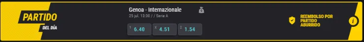El favorito para ganar en este partido es el Inter de Milán, que paga 1.54 veces lo que juegues, en desmedro de los 6.40 que paga Genoa si piensas que ellos serán los ganadores. Ahora, el empate paga 4.51 veces lo que apuestes.