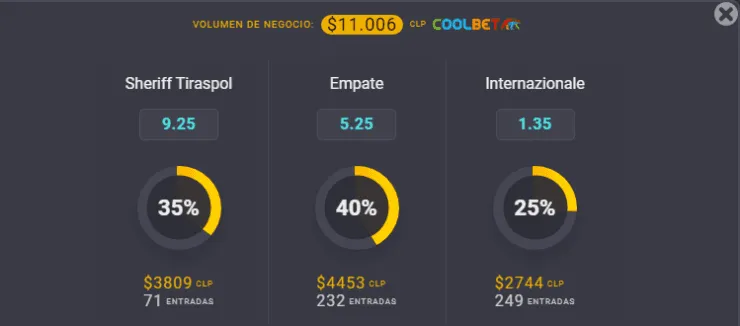 Para el OSO de Coolbet, el gran favorito para ganar este partido de la cuarta jornada de la fase de grupos de la UEFA Champions League es Inter de Milán, que paga 1,35 veces lo que apuestes, por sobre los 9.25 que paga Sheriff, si los locales dan la sorpresa. Ahora, el empate entre ambos paga 5,25 veces lo que juegues.
