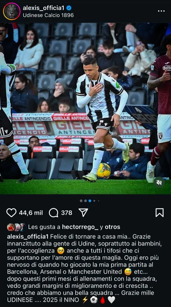 Fue en su Instagram personal donde Alexis Sanchez se desahogó tras su regreso a los partidos de Udinese, donde apuntó el gran recibimiento de los hinchas en el duelo del domingo.