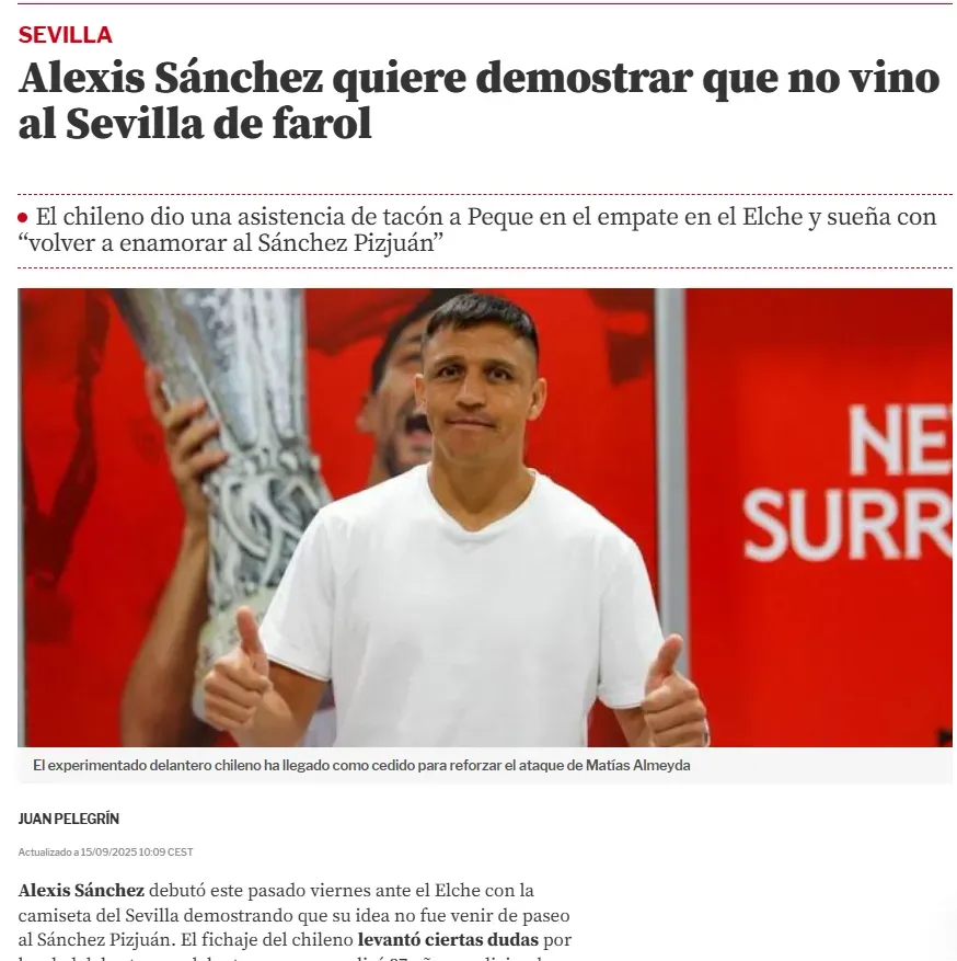 “Está integrado, comprometido y desea aportar su experiencia para ayudar a los más jóvenes”, destaca el prestigioso medio español, quien además resaltó que en su estreno ante Elche “ayudó a activar al ataque sevillista colocándose entre líneas y buscando líneas de pase.