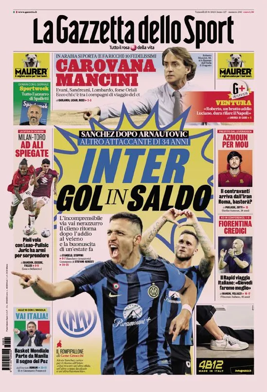 Sánchez vuelve a ser portada en la prensa deportiva italiana y se tomó la primera página de La Gazzetta dello Sport después de mucho tiempo. Eso sí, el diario rosa de en La Bota no fue muy amistoso que digamos. “Sánchez después de (Marko) Arnautovic, otro delantero de 34 años. Gol en venta en el Inter”, tituló la Gazzetta.