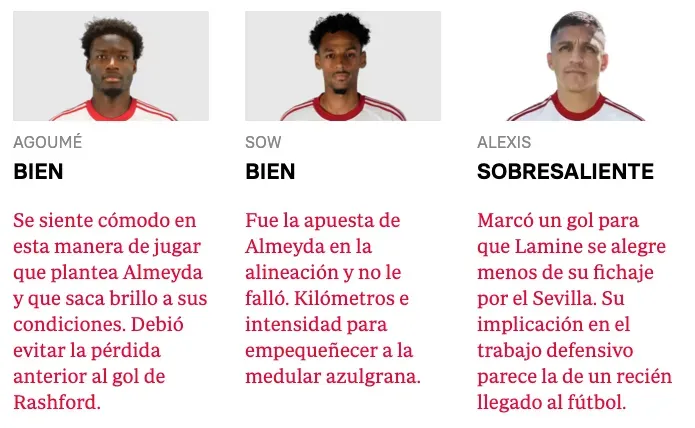 “Marcó un gol para que Lamine se alegre menos de su fichaje por el Sevilla. Su implicación en el trabajo defensivo parece la de un recién llegado al fútbol”, destacaron sobre la entrega del delantero que a sus 36 años se acerca a su prime nuevamente.