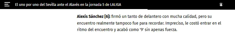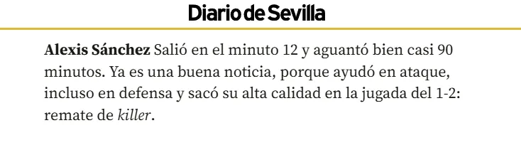 Diario de Sevilla, por un lado, comentó que “aguantó bien casi 90 minutos. Ya es una buena noticia, porque ayudó en ataque, incluso en defensa y sacó su alta calidad en la jugada del 1-2: remate de killer“, comentaron.