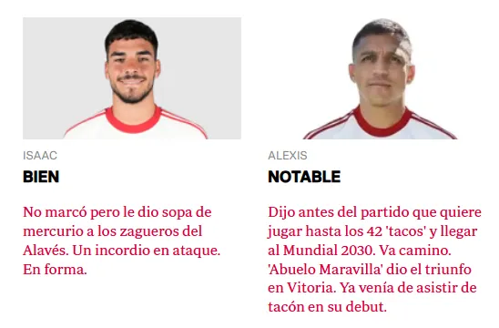 Finalmente, ABC de Sevilla en su suplemento Orgullo de Nervión lo resumió en una palabra: Notable, junto con destacar parte de su entrevista a AS. “Dijo antes del partido que quiere jugar hasta los 42 ‘tacos’ y llegar al Mundial 2030. Va camino. ‘Abuelo Maravilla’ dio el triunfo en Vitoria“, escribieron.
