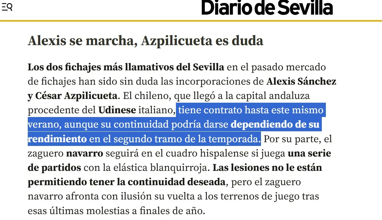 El Diario de Sevilla fue muy claro en cuanto a su futuro. “Alexis se marcha”, establece en su edición digital, lo que sentencia su estadía en Nervión.