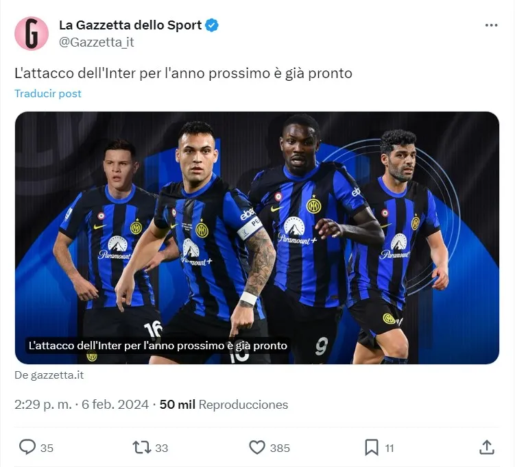 Es el caso del diario La Gazzetta dello Sport, quien afirmó en su titular que “el ataque del Inter de Milán para la próxima temporada está listo“, con el argentino Lautaro Martínez y el francés Marcus Thuram como sus principales émbolos.