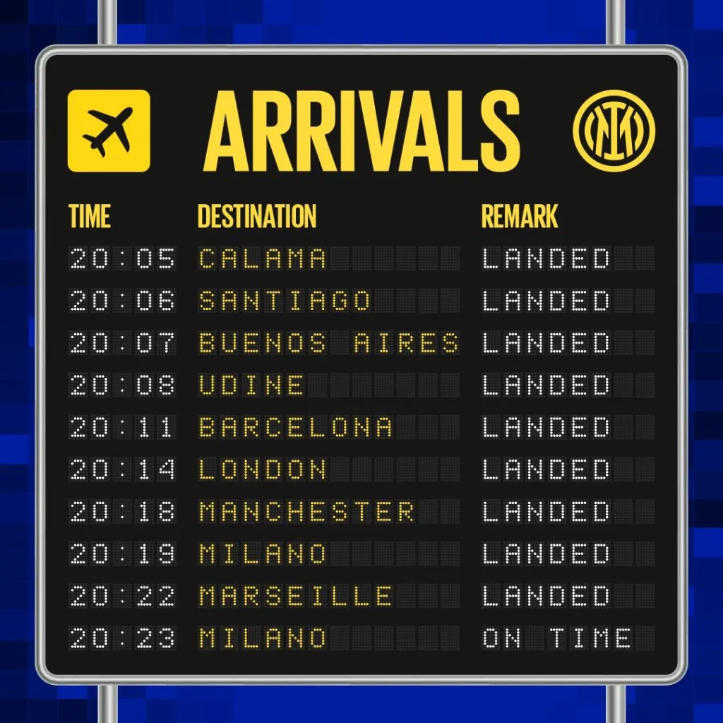 A modo de aeropuerto, el Inter repasó la carrera de Alexis como si fueran vuelos, resumiendo los clubes que ha defendido el delantero chileno con las ciudades y año respectivo en los que “aterrizó”, manifestando “un pasaje, por favor”.