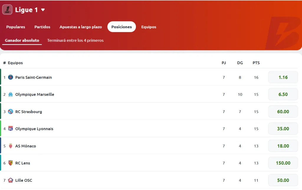 Luego de siete jornadas disputadas en la presente temporada del torneo, ya está disponible el mercado al ganador absoluto Ligue 1. PSG con 16 puntos lidera la tabla de clasificación y es el principal favorito al título.