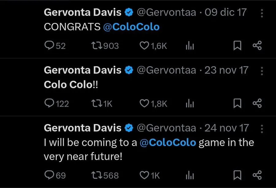 En algunos de los mensajes que Davis publicó en Twitter (Ahora ‘X’)y en su cuenta de Instagram simplemente escribió “Colo Colo”, en otro prometió asistir a un duelo del Cacique e incluso un mes después del primer mensaje, publicó un tweet felicitando a los albos por coronarse campeones y haber logrado la 32° estrella de su historia.