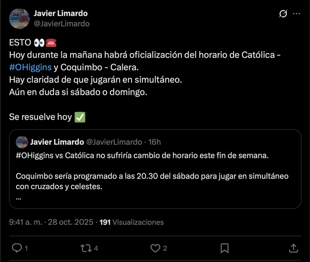 “Durante la mañana de este martes habrá oficialización del horario para Católica-O’Higgins y Coquimbo-La Calera”, indicó el comunicador quien advierte que la duda pasa por si estos duelos se disputarán el sábado 1 o domingo 2 de noviembre. “Se define hoy”, añade.