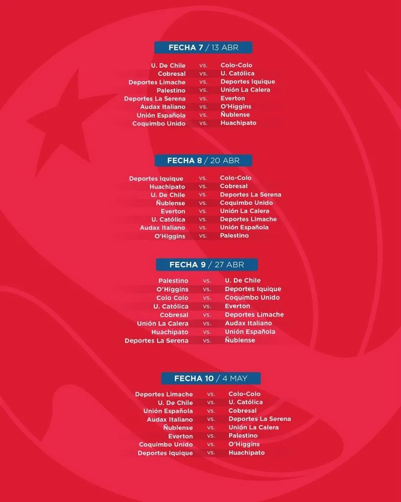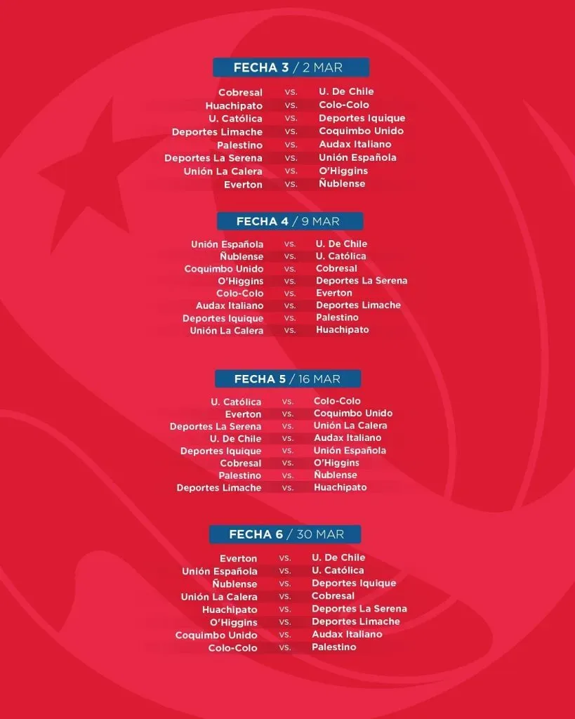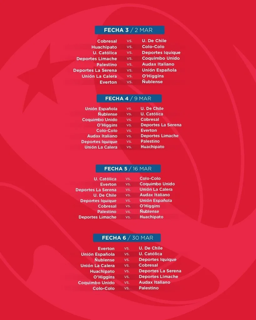 El primero de ellos será el de “Colonias” entre Unión Española y Palestino por la fecha 2. En la quinta jornada, el 16 de marzo, Universidad Católica será local de Colo Colo. Tres semanas después, el 13 de abril, los albos jugarán el Superclásico contra Universidad de Chile en el Estadio Nacional.