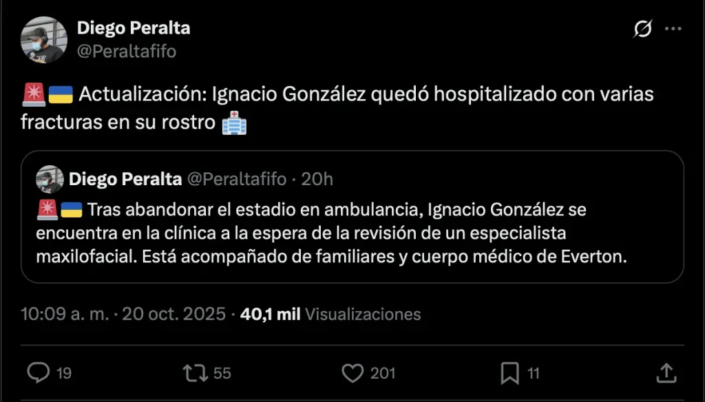 En ese lugar, agrega el reportero, se le hizo una revisión por medio de un especialista maxilofacial, quien ordenó la hospitalización del meta de Everton, puesto que “sufrió múltiples fracturas en su rostro“. Una pésima noticia para los viñamarinos.