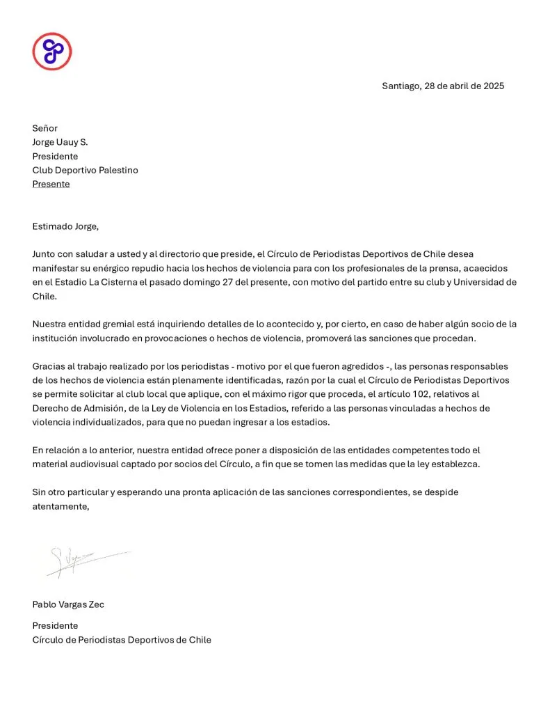 Ante esta problemática, el Círculo de Periodistas Deportivos (CPD) hizo pública una carta dirigida al presidente de Palestino, Jorge Uauy, donde exigen la aplicación del Derecho de Admisión contra estos hinchas por Ley de Violencia en los Estadios.