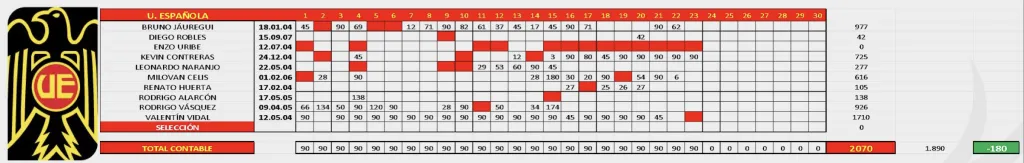 Sin embargo, el equipo que más minutaje acumula para el cumplimiento de la Regla Sub 21 es Unión Española, que ya tiene 2.070 producto de la aparición de jóvenes como los defensores Kevin Contreras y Valentín Vidal, el volante Bruno Jáuregui o el seleccionado Sub 20 Milován Célis.