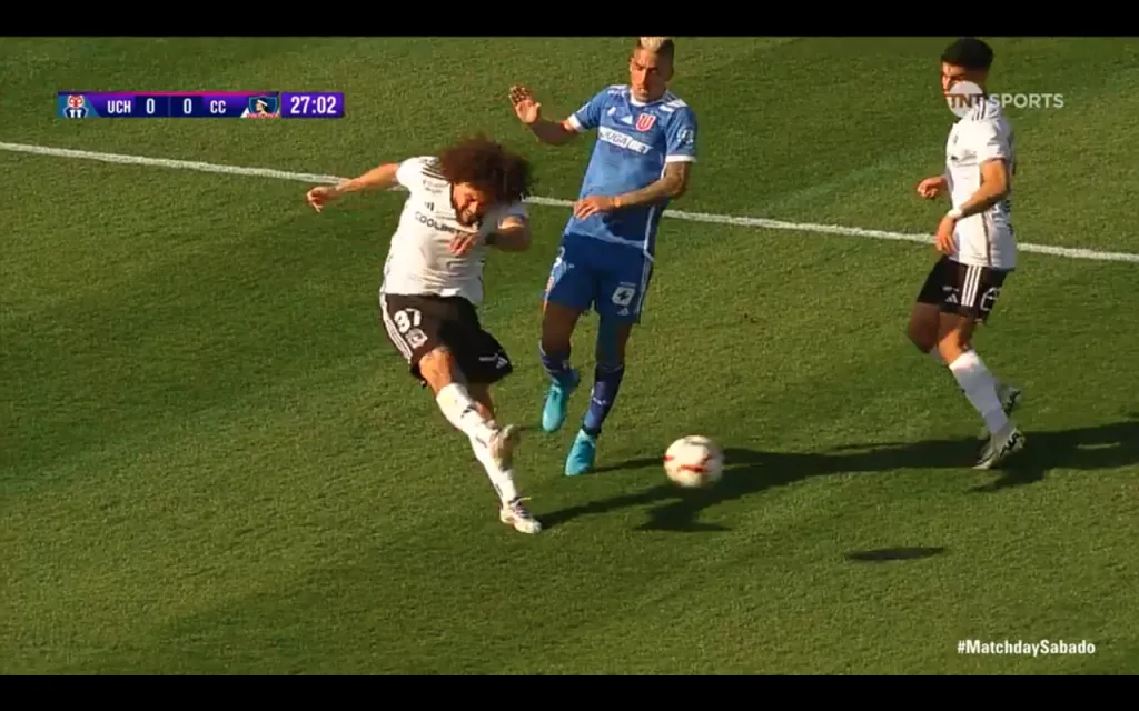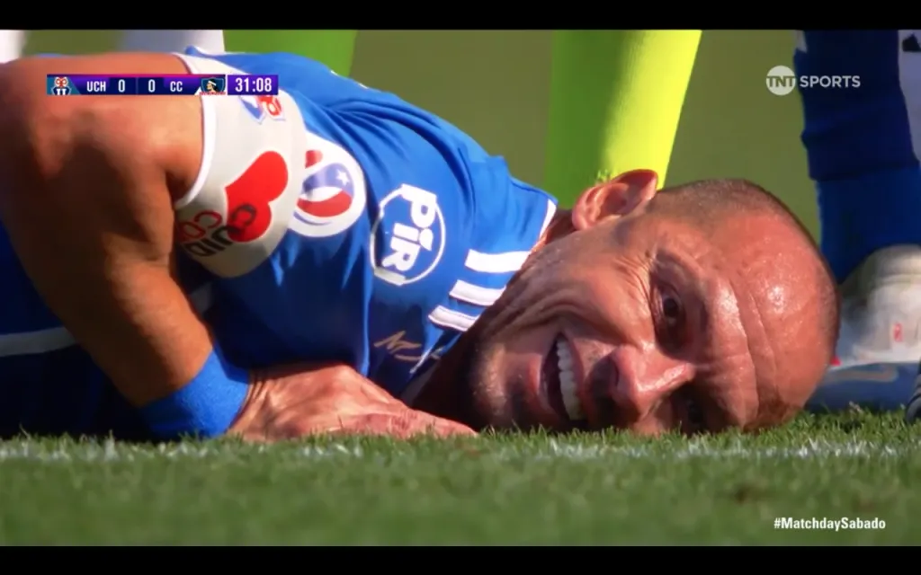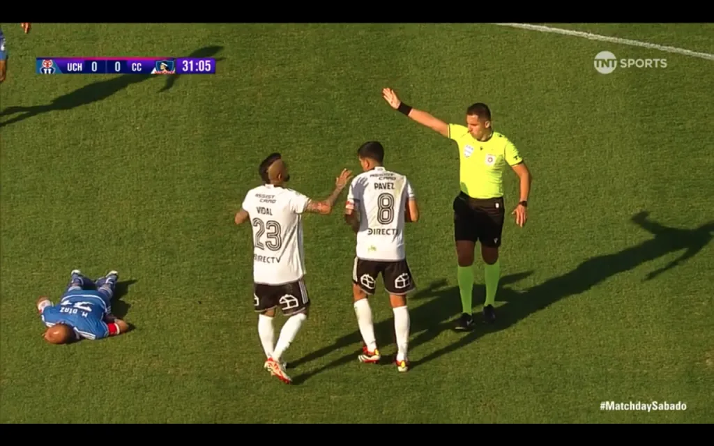 Otra jugada extraña ocurrió cuando, en un contraataque azul a los 31′, Marcelo Díaz se escapaba y fue derribado por Esteban Pavez. Las cámaras enfocaron entonces de cerca al jugador del Romántico Viajero.