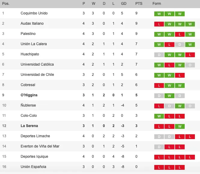 Tabla: O’higgins y La Serena reparten puntos en San Fernando y le dan una mano a Colo Colo