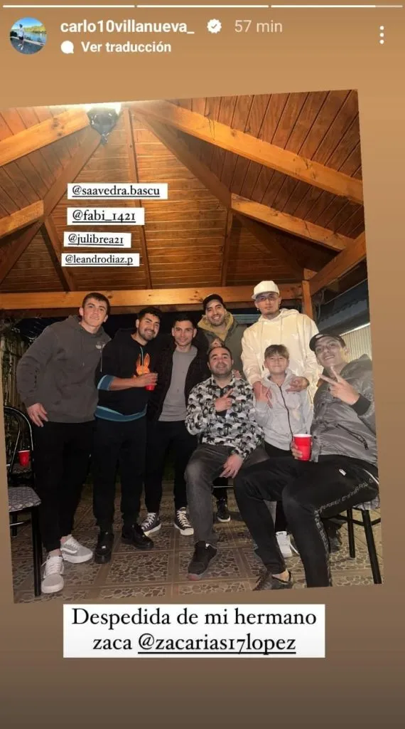 Uno que mostró una fotografía del encuentro fue Carlo Villanueva, volante ofensivo que llegó al cuadro de la usina después de terminar su contrato con Colo Colo. “Despedida de mi hermano Zaca”, escribió el enganche de 25 años, quien vive su segunda temporada en el Huachi. Junto a él apareció el argentino Julián Brea.