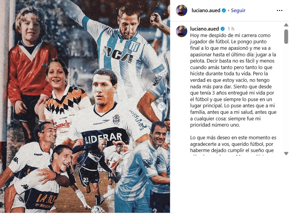“Podría escribir muchísimas cosas más, pero nada alcanzaría para poner en palabras la felicidad y, a la vez, la tristeza que siento porque esta etapa se termina. ¿El resumen perfecto? Aquellas tardes de chico cuando me mandaba alguna macana y mi vieja me decía que no iba a fútbol. El llanto que me provocaba es igual al que tengo hoy. Solo que esta vez es definitivo”, señala en su publicación.