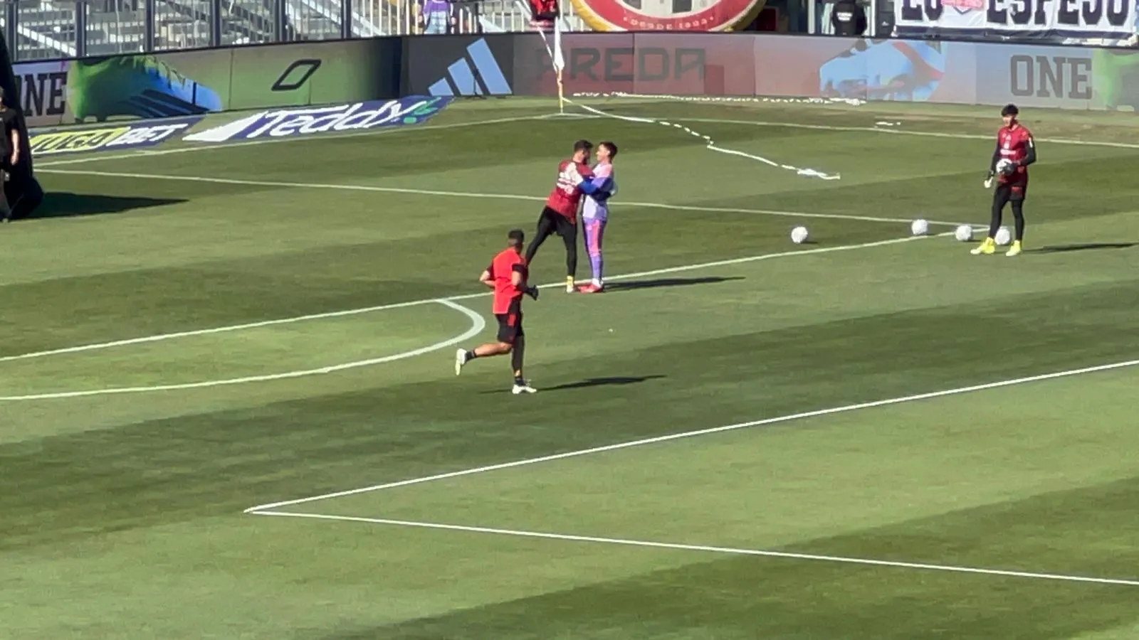 Fernando De Paul y Cristopher Toselli, coincidieron en la Universidad de Chile en 2023 y ahora se saludan en la cancha del Monumental.