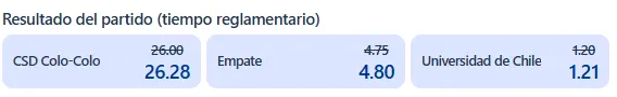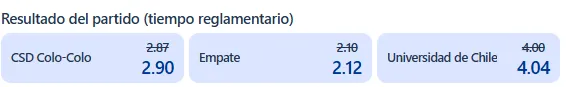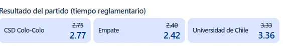 Tienes las mejores cuotas con JugaBet. ¿Qué esperas para jugártela con un resultado? En estos momentos, un triunfo de Colo Colo paga 2,44; el empate da 3,43; y una victoria de la U paga 3,19. Puedes apostar aquí