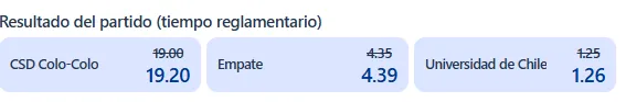 En estos momentos, Colo Colo paga 2,27; el empate 3,38; y un triunfo de la Universidad de Chile estaría dando 3,14. Puedes desplegar tu talento predictivo aquí