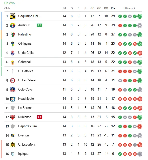 Aún con dos partidos por disputar, y una vez consumada la victoria de Audax Italiano por 3-2 a Ñublense, así queda la tabla de posiciones de la Liga de Primera 2025. El resultado deja a los coquimbanos punteros por diferencia de gol.