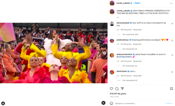 A través de su cuenta de Instagram, Camila Cabello celebró su presentación en la final de la UEFA Champions League. En la publicación, también aprovechó de confesar un problema que tuvo en plena cancha.