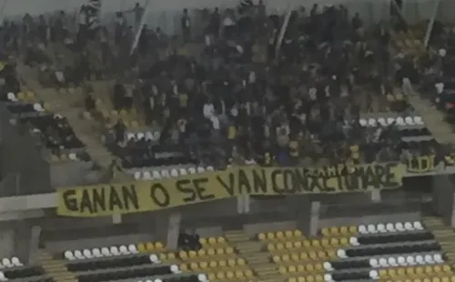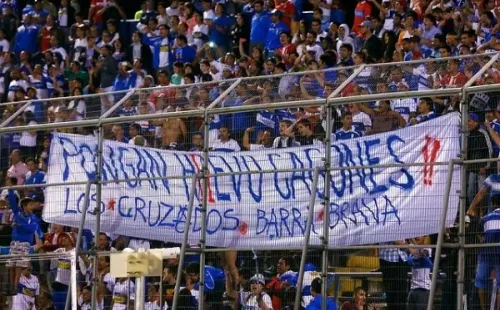 Universidad Católica no se queda atrás y también, en una de sus tantas crisis, la barra cruzada posó con un lienzo “Pongan huevos cagones”, además de cánticos de todo el estadio.