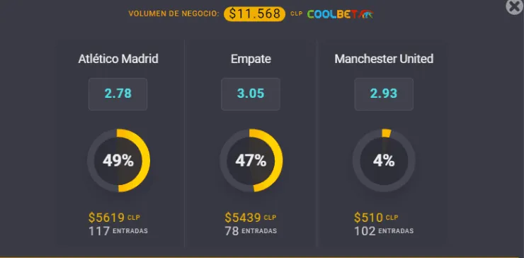 El favorito para el OSO de Coolbet en la ida de los octavos de final de la UEFA Champions League es Atlético de Madrid, que paga 2,78 veces lo que juegues, por sobre los 2,93 que paga Manchester United si piensas que termina en triunfo de los Diablos Rojos. Ahora, si te la juegas por el empate, paga 3,05 veces lo que apuestes.