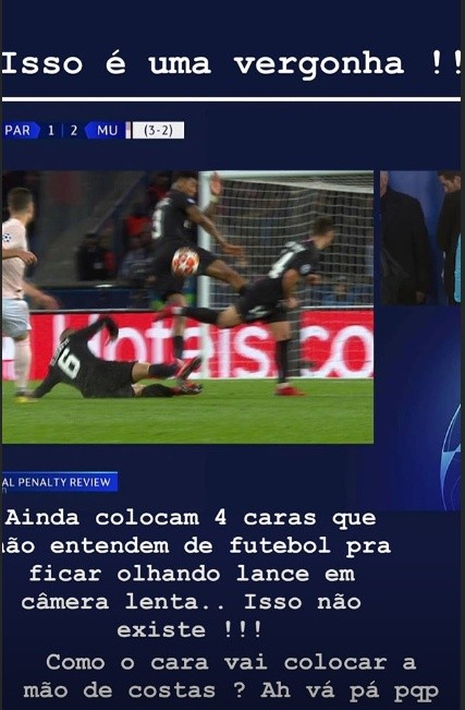 “¡Esto es una vergüenza! Además, colocan a cuatro hombres que no saben nada de fútbol para mirar la jugada en cámara lenta. ¡Eso no existe! ¿Cómo va a poner la mano de espaldas? Váyanse a la PQP”, reclamó en InstagramStory un Furioso Neymar.