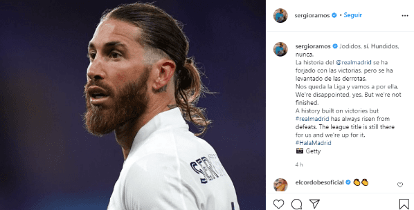 “La historia delReal Madrid se ha forjado con las victorias, pero se ha levantado de las derrotas. Nos queda La Liga y vamos a por ella”, añadió el defensor en sus redes sociales en alusión a los compromisos que le restan a los dirigidos por Zinedine Zidane.