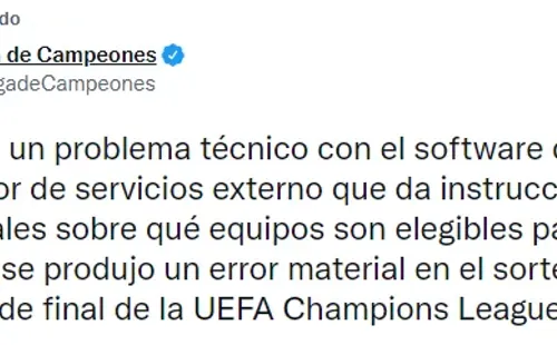 Los colchoneros se emparejaron con Bayern Munich pero los reclamos no se hicieron esperar, algo que el ente europeo aceptó. “Tras un problema técnico con el software de un proveedor de servicios externo que instruye a los árbitros sobre qué equipos son elegibles para jugar entre sí, se produjo un error material en el sorteo de los octavos de final de la UEFA Champions League”, explicaron.