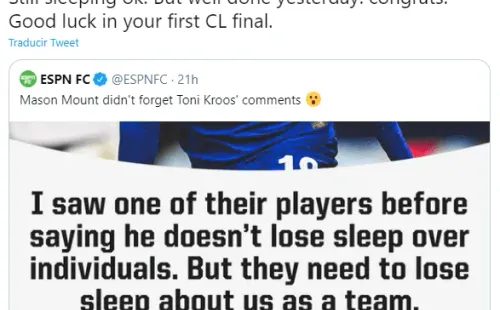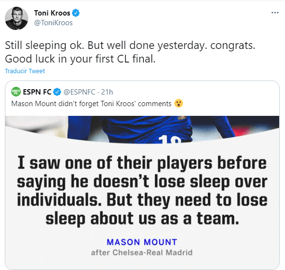 El experimentado Kroos pegó de vuelta y sacó a relucir toda su hoja de vida como múltiple ganador de la competición europea y en Twitter citó una publicación con las declaraciones de Mount. “Sigo durmiendo bien. Pero bien hecho ayer, felicitaciones. Buena suerte en tu primera final de Champions League”.
