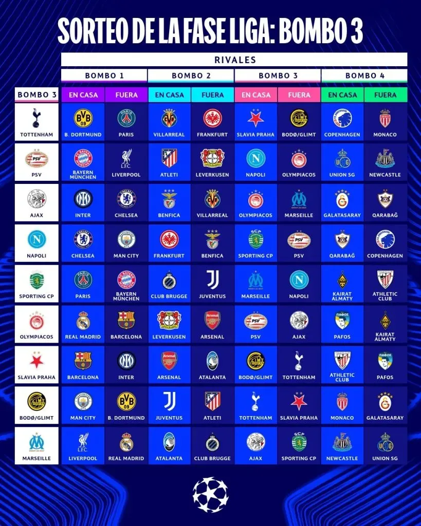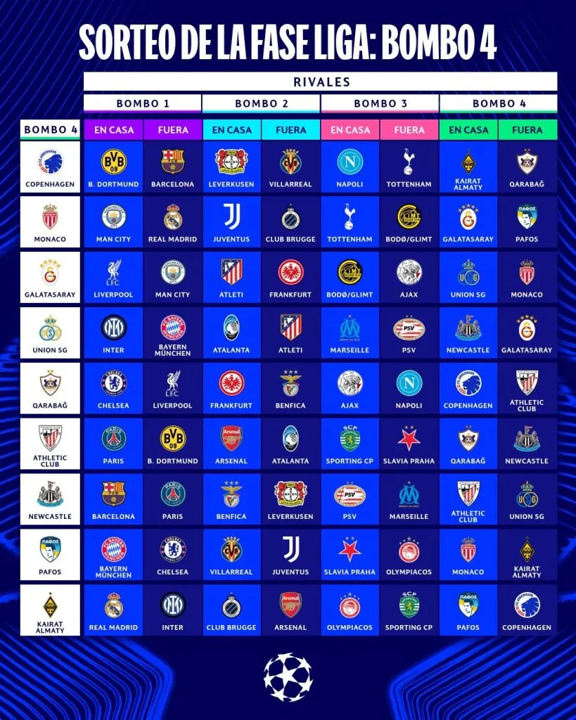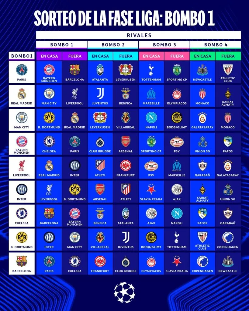 Repasa a continuación como quedaron conformados los emparejamientos y arma los partidazos que vendrán en la Champions League 2025/26 a partir del mes de septiembre: