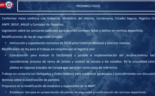 La ANFP se presentó este pasado martes en el Congreso para exponer ante la Comisión de Deportes de la cámara un plan de seguridad que ayude al fútbol chileno a recuperar el espacio perdido por la familia en los estadios, y de pasoerradicar los hechos acontecidos en el último tiempo.