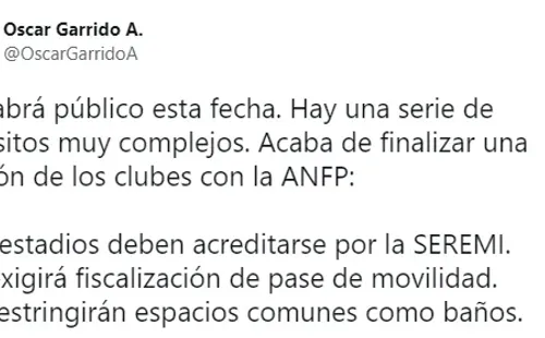 Según explicó el periodista de Radio Agricultura, Oscar Garrido, los principales requisitos puestos fueron las acreditaciones que debían cumplir los estadios ante la Seremi de Salud, la definición del protocolo de fiscalización del pase de movilidad y que, además, estarán clausurados los espacios comunes como los baños.