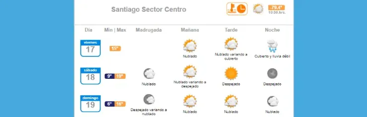 Según el pronóstico, las precipitaciones se dejarán caer esta noche de viernes y en la madrugada del sábado, pero posteriormente darán paso cielos parcialmente despejados, por lo que el escenario del Estadio Nacional ofrecerá una cancha mojada, pero con fríos 13 a 16°C durante el duelo válido por la 13ª fecha del Campeonato Nacional.