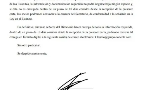 Como si fuera poco y según explica el reglamento, Bravo pidió que esta información sea entregada en un plazo máximo de 10 días. De lo contrario, “los socios podremos convocar a la censura del secretario”, apuntando a Luis Marín.
