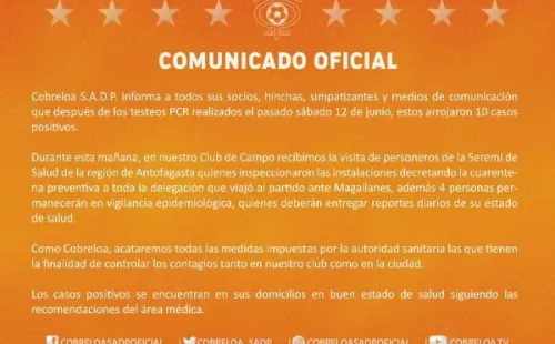 Por otro lado, en el club recalcaron que aceptarán lo recomendado. “Como Cobreloa acataremos todas las medidas impuestas por la autoridad sanitaria, las que tienen la finalidad de controlar los contagios tanto en nuestro club como en la ciudad“.