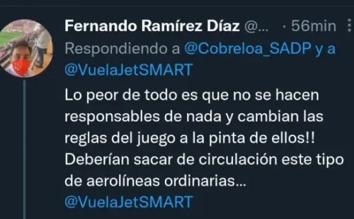 “Lo peor de todo es que no se hacen responsables de nada y cambian las reglas del juego a la pinta de ellos!! Deberían sacar de circulación este tipo de aerolíneas ordinarias…”, comentó en Twitter Fernando Ramírez, presidente de Cobreloa.