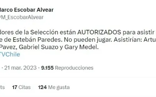 Una situación que generaba conflicto al interior de la Selección y que finalmente fue saldada: Arturo Vidal, Gabriel Suazo, Esteban Pavez y Gary Medel, invitados por Paredes al partido preeliminar, estarán presentes en la cita, aunque finalmente no podrán jugar, de acuerdo a lo informado por DirecTV.