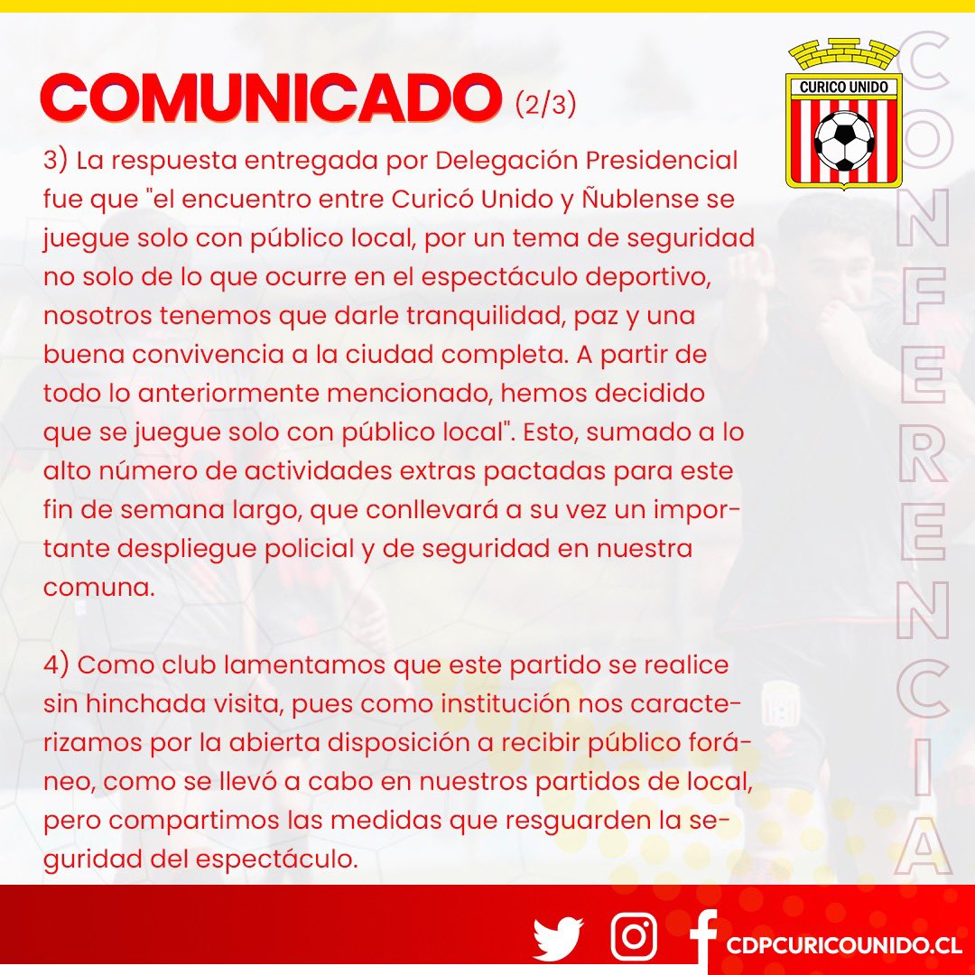“La respuesta entregada por la Delegación Presidencial fue que “el encuentro entre Curicó Unido y Ñublense se juegue sólo con público local, por un tema de seguridad no solo de lo que ocurre en el espectáculo deportivo, nosotros tenemos que darle tranquilidad, paz y una buena convivencia a la comunidad completa. A partir de todo lo mencionado, hemos decidido que se juegue sólo con público local”, enfatizan.