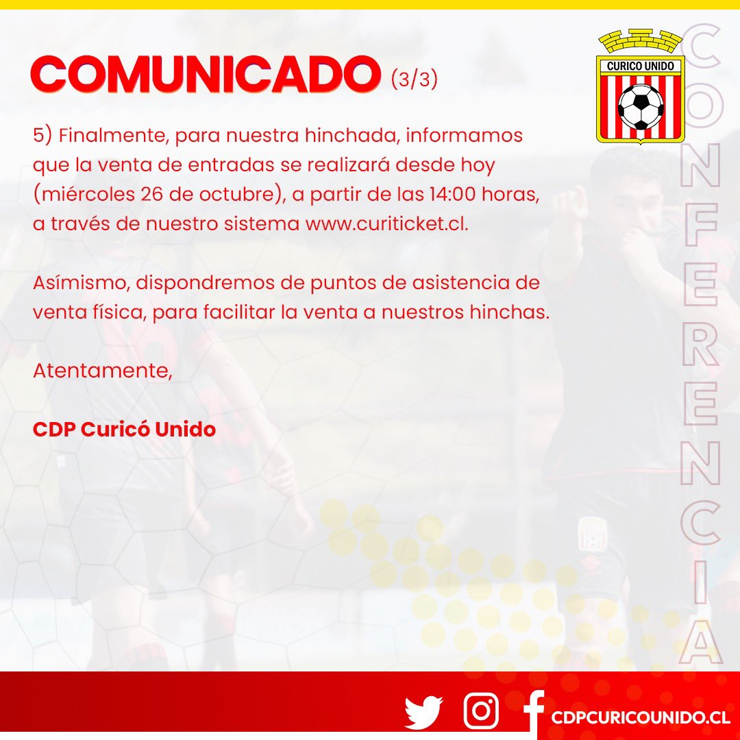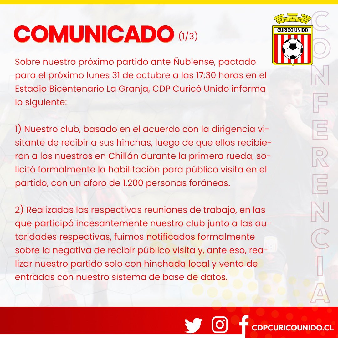 Eso sí, tras minutos del comunicado, Curicó Unido lo bajó de sus redes sociales oficiales, aunque queda el registro que el duelo clave será sin visitantes.