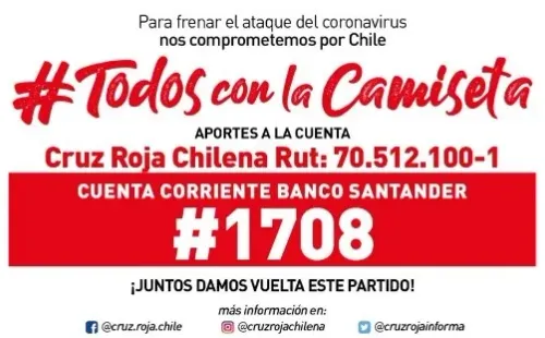 Para colaborar con #TodosConLaCamiseta puedes aportar en la cuenta #1708 del Banco Santander de Chile con el RUT de la Cruz Roja Chilena, el 70.512.100-1.