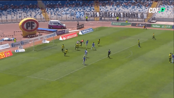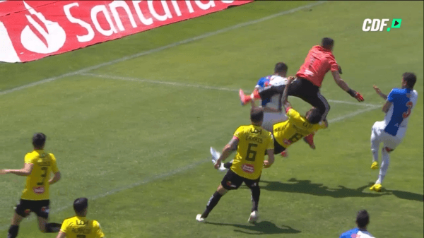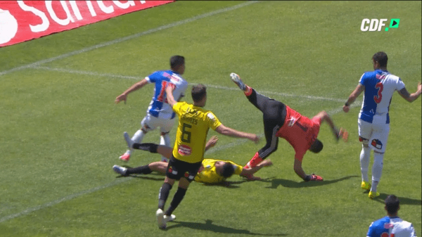 Cuando terminaba la etapa inicial, el conjunto de Rancagua defendía una pelota parada en contra y en el centro tanto el portero como el defensor fueron en busca del balón teniendo un contundente choque.