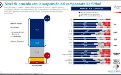 Resulta que Pulso Ciudadano de Activa Research realizó una encuesta donde se le preguntó a los encuestados respecto a si fue correcta la decisión de la ANFP de suspender definitivamente los campeonatos, y la muestra arrojo que un 62, 2% apoya la media versus 12,8 que la rechaza.