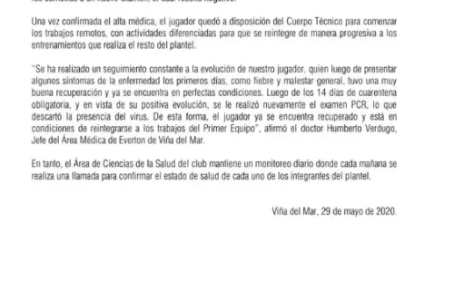 Buenas noticias para el fútbol chileno y, quizás, un paso más a la reanudación de la actividad. Este viernes, Everton de Viña del Mar informó la recuperación de su jugador contagiado con coronavirus.